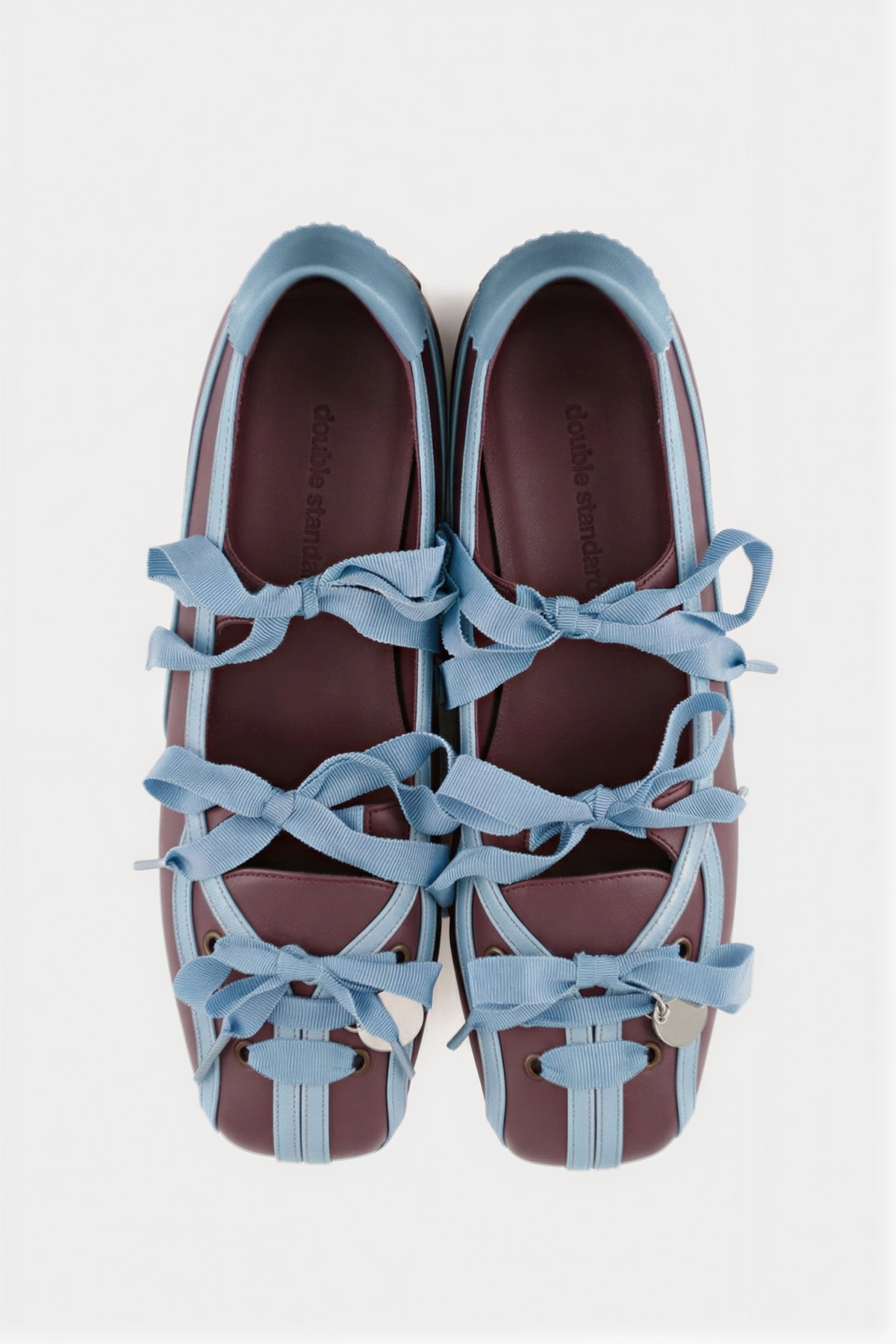 Flats made from vegan plum leather with dusty blue stripes, complete with dusty blue lace-up ribbons.