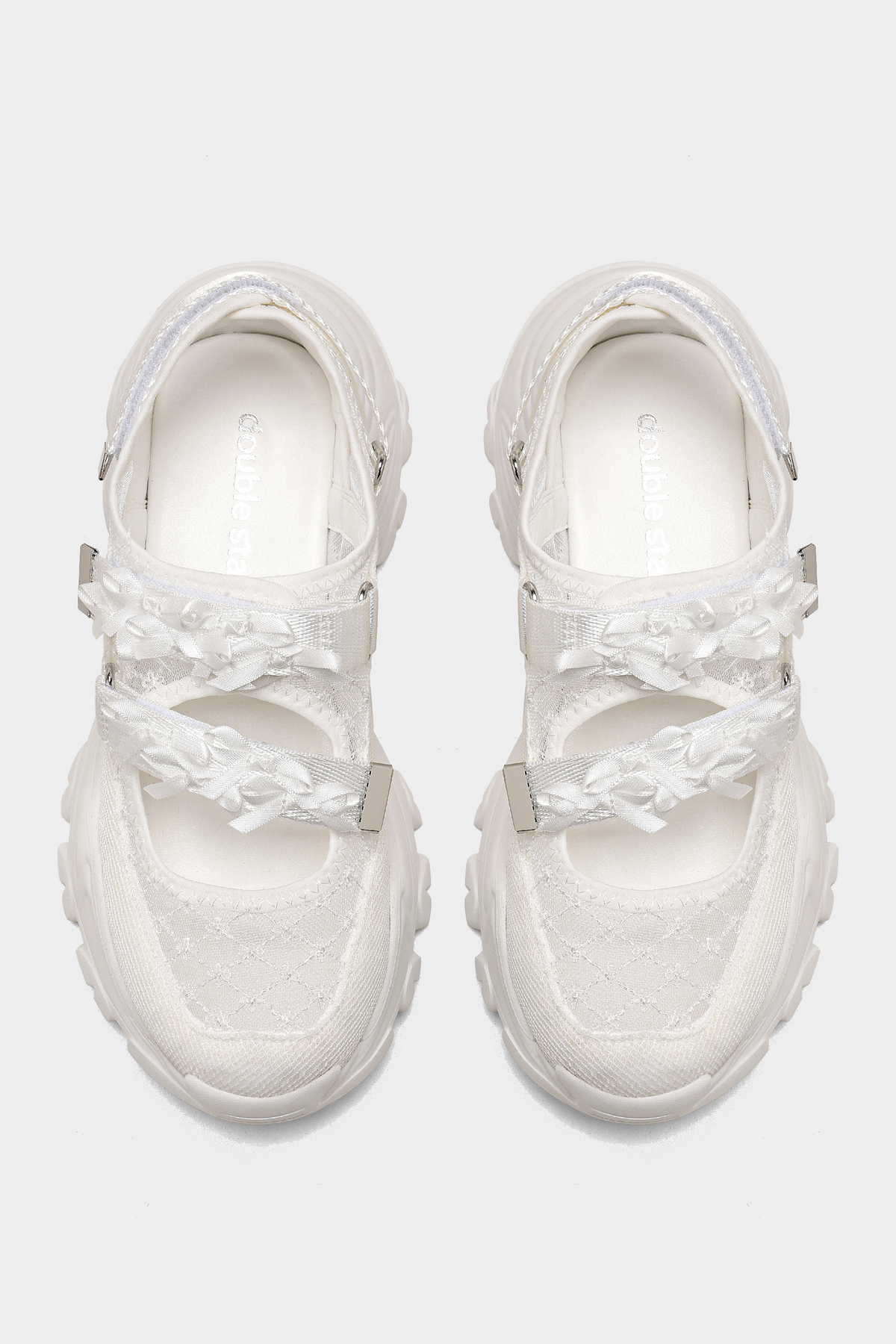 The Shannon sneakers are sheer, lacey, covered in bows with a chunky rubber sole - so you can go from 0 (daintily frolicking) to 100 (racing to your dinner date at mach speed) real quick. Styled here with our Bonnet socks for extra EXTRA lace.