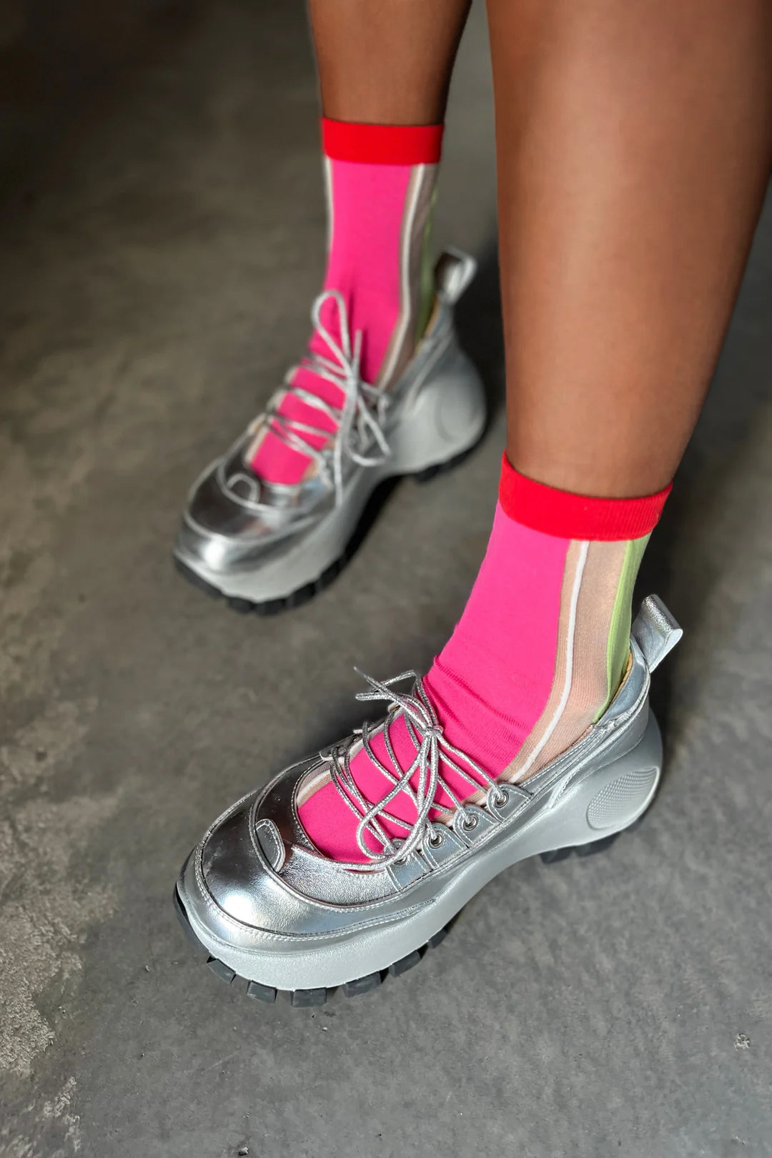 The perfect shoe for avant-garde athletics, complete with metallic silver leather, a sporty platform and silver laces. Shown here with our Vacation Socks in Italia