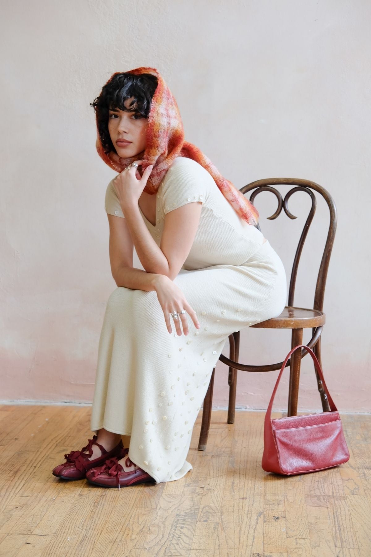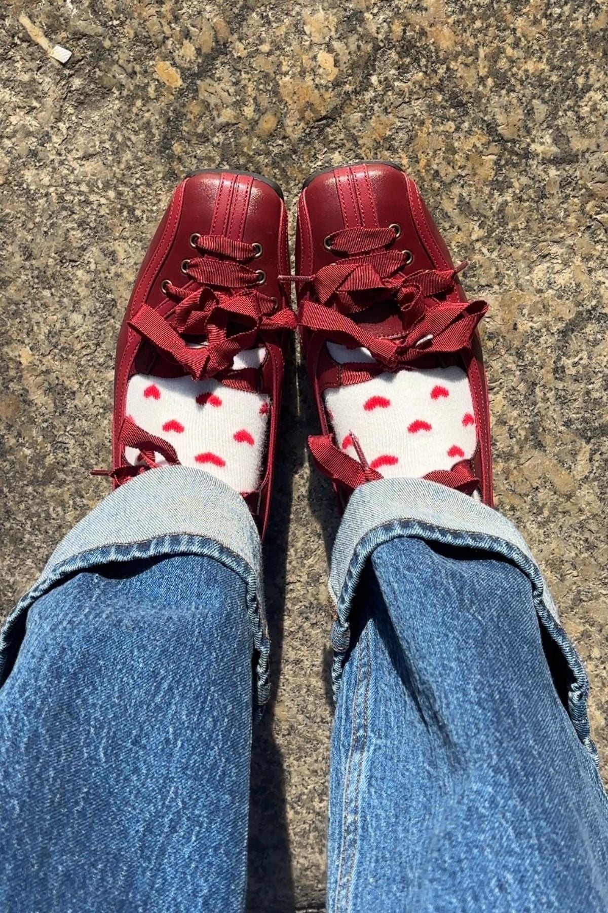 Flat soles made from burgundy vegan leather, complete with red lace-up ribbons.