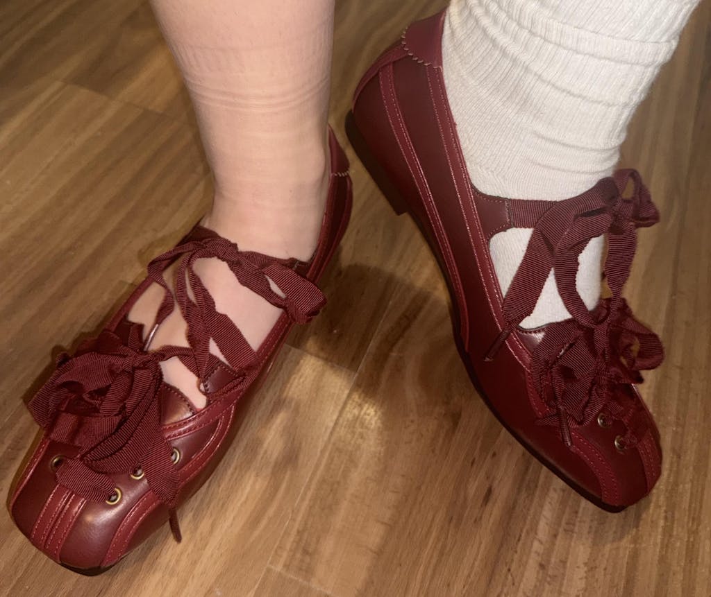 Flat soles made from burgundy vegan leather, complete with red lace-up ribbons.
